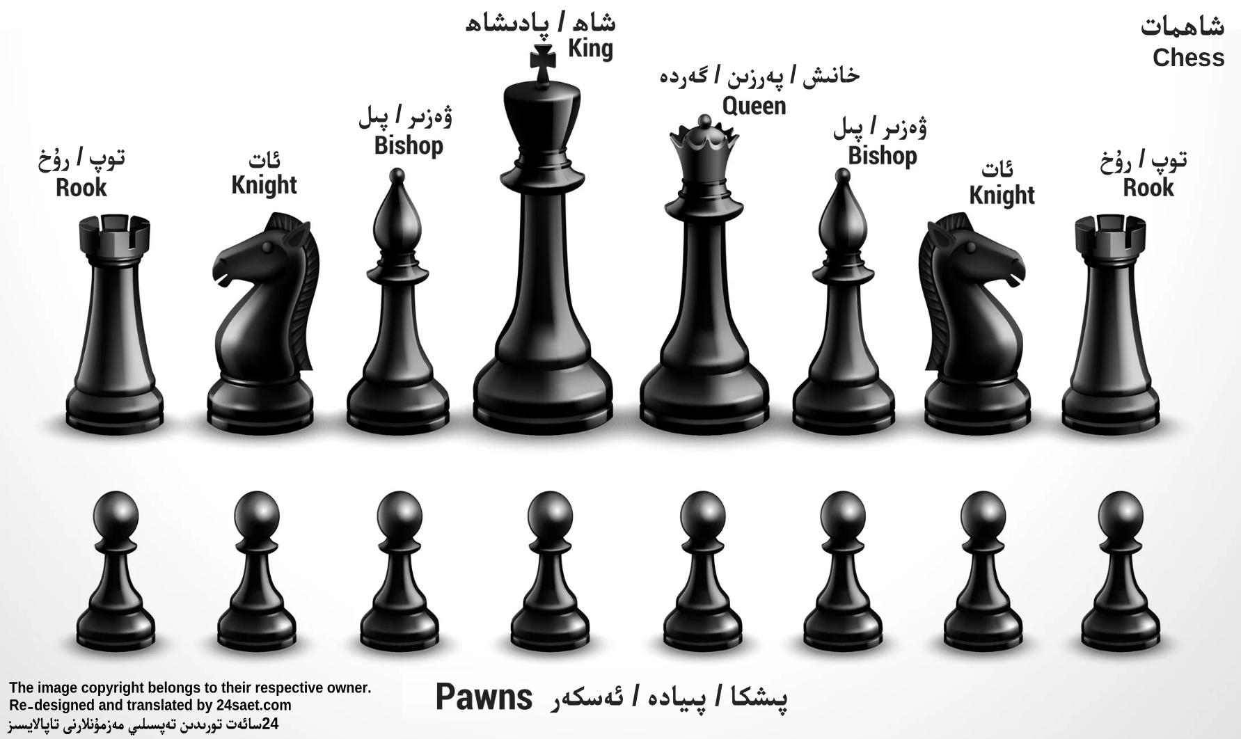 - توپ (Rook): تىك ۋە توغرا يۆنىلىشلەردە خالىغانچە ئارىلىققا يۆتكىلەلەيدۇ. ئوچۇق لىنىيەلەردە ئىنتايىن كۈچلۈك رول ئوينايدۇ. ئۇيغۇرچە باشقا ئاتىلىشلىرى : توپ / رۇخ
