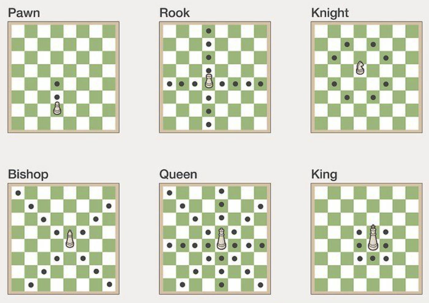 - پىشكا (Pawn): ئەڭ ئاددىي خان بولسىمۇ، ئۇنىڭ ئىستراتېگىيىلىك ئەھمىيىتى زور. ئادەتتە ئالدىغا بىر قەدەم ماڭىدۇ، لېكىن باشلىنىش ئورنىدىن تۇنجى قېتىم ماڭغاندا ئىككى قەدەم ماڭسا بولىدۇ. ئۇ قارشى تەرەپنىڭ خانىسىنى قىياس يۆنىلىشتە بىر قەدەم ئالدىغا مېڭىپ ئالىدۇ. ئۇيغۇرچە باشقا ئاتىلىشلىرى : پىشكا / پىيادە / ئەسكەر